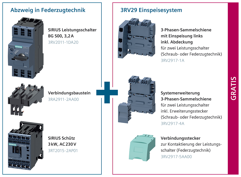 Load feeder fuseless, Reversing duty 400 V AC, Size S00 3.50...5.00 A 230 V AC screw terminal for installation on standard mounting rail Type of coordination 1, Iq = 150 kA 1 NC (contactor) Reversing starter SIRIUS 3RA22 for protecting and starting motors.The 3RA22 reversing starter is a proven and factory-fitted combination of a 3RV2 motor starter protector and two 3RT2 contactors which are already fully wired and connected both mechanically and electrically. They are climate-resistant, approved for worldwide use (e.g. IEC and UL/CSA) and are IE3/IE4-ready.The 3RA2 load feeders are available with AC and DC operation in the sizes S00, S0 and S2 with setting ranges from 0.14 to 65 A. They are offered with screw terminals or spring-loaded terminals for mounting on DIN rails, screw mounting and installation on 60 mm busbars. In addition, we offer more than 40,000 other proven combinations of individual devices for safeguarding, switching and starting a wide variety of applications up to 630 A.All the accessories for 3RV2 motor starter protectors and for 3RT2 contactors are standard for all sizes and can be used for installing load feeders. The optional SIRIUS 3RV29 infeed system (for S00 andS0) considerably reduces the wiring outlay.The 3RA22 load feeders replace the tried and tested 3RA12 series.Simple, efficient and always up to date - SIRIUS modular system.