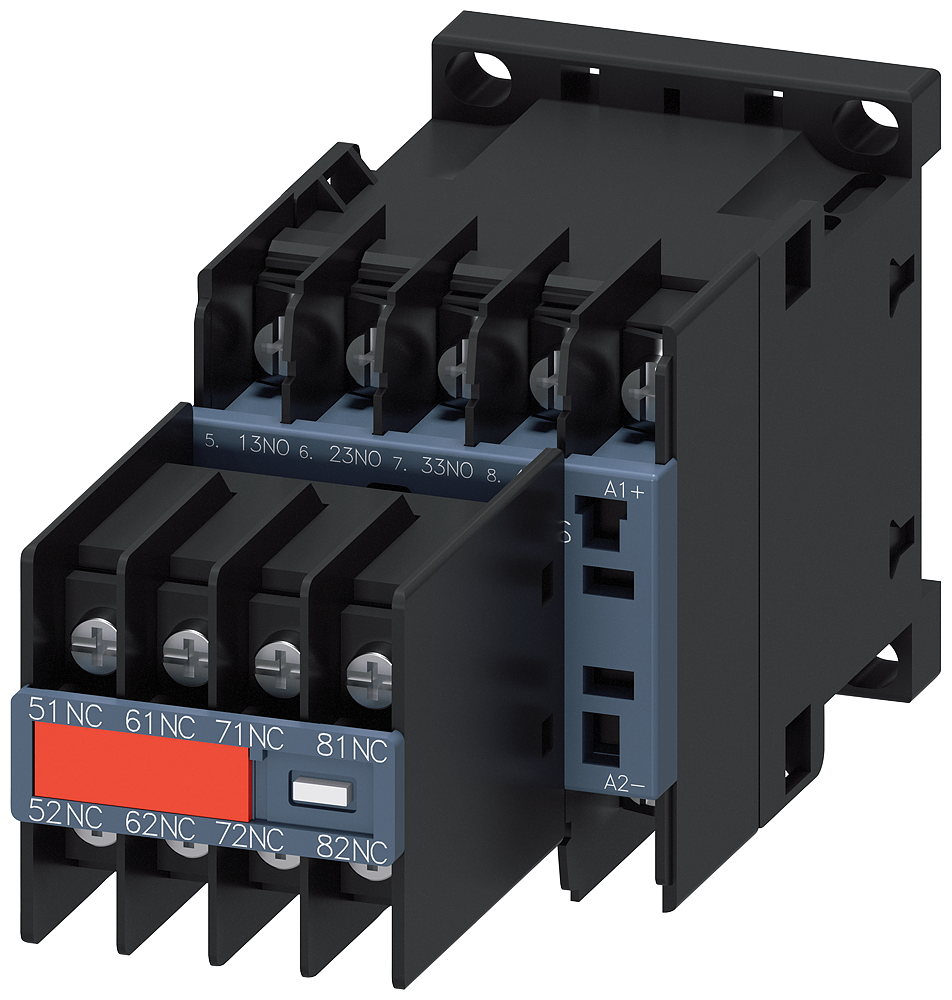 Contactor relay, 6 NO + 2 NC, 110 V AC 50 Hz / 120 V 60 Hz, Size S00, spring-type terminal, Captive auxiliary switch, Auxiliary contactor SIRIUS 3RH2 for switching the control signals in the control circuit.The SIRIUS 3RH2 contactor relays have standard-compliant terminal designations and a reliable and time-saving connection technology. Thanks to the multiplication of outputs, simultaneous switching of several auxiliary circuits is possible. All contacts are available with positively driven operation for safety applications as well as SUVA versions. The contactor relays are climate-resistant, have a high contact reliability and are suitable for use worldwide thanks to the corresponding approvals (e.g. IEC and UL/CSA).They are available with AC or DC operation and with screw or spring-loaded terminals. The basic version of the contactor relays is a 4-pole design which can be extended up to 8 poles by means of snap-on auxiliary switches.The extensive range of accessories for the 3RT2 contactors in sizes S00 to S3 can also be used for the 3RH2 contactor relays.The 3RH2 contactor relays replace the well-proven 3RH1 series.Simple, efficient and always up to date - SIRIUS modular system.