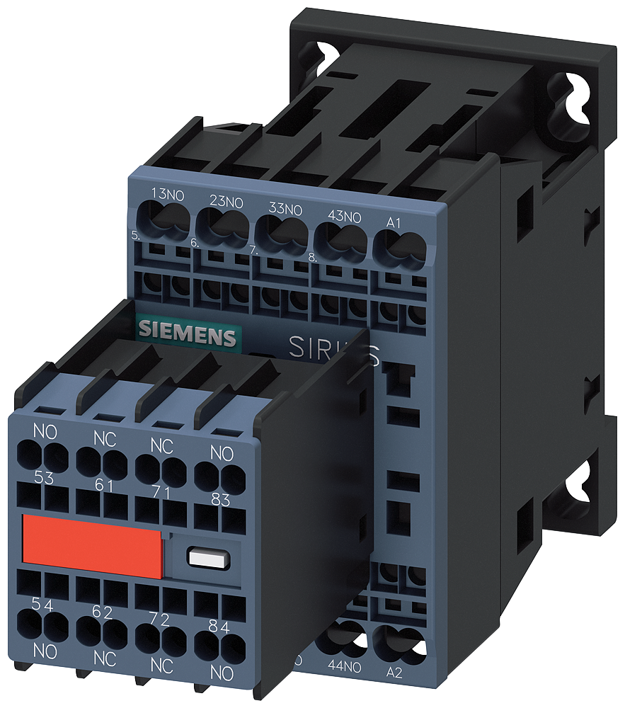 Contactor relay, 4 NO + 4 NC, 230 V AC, 50 / 60 Hz, Size S00, screw terminal, Removable auxiliary switch EN 50005 Auxiliary contactor SIRIUS 3RH2 for switching the control signals in the control circuit.The SIRIUS 3RH2 contactor relays have standard-compliant terminal designations and a reliable and time-saving connection technology. Thanks to the multiplication of outputs, simultaneous switching of several auxiliary circuits is possible. All contacts are available with positively driven operation for safety applications as well as SUVA versions. The contactor relays are climate-resistant, have a high contact reliability and are suitable for use worldwide thanks to the corresponding approvals (e.g. IEC and UL/CSA).They are available with AC or DC operation and with screw or spring-loaded terminals. The basic version of the contactor relays is a 4-pole design which can be extended up to 8 poles by means of snap-on auxiliary switches.The extensive range of accessories for the 3RT2 contactors in sizes S00 to S3 can also be used for the 3RH2 contactor relays.The 3RH2 contactor relays replace the well-proven 3RH1 series.Simple, efficient and always up to date - SIRIUS modular system.