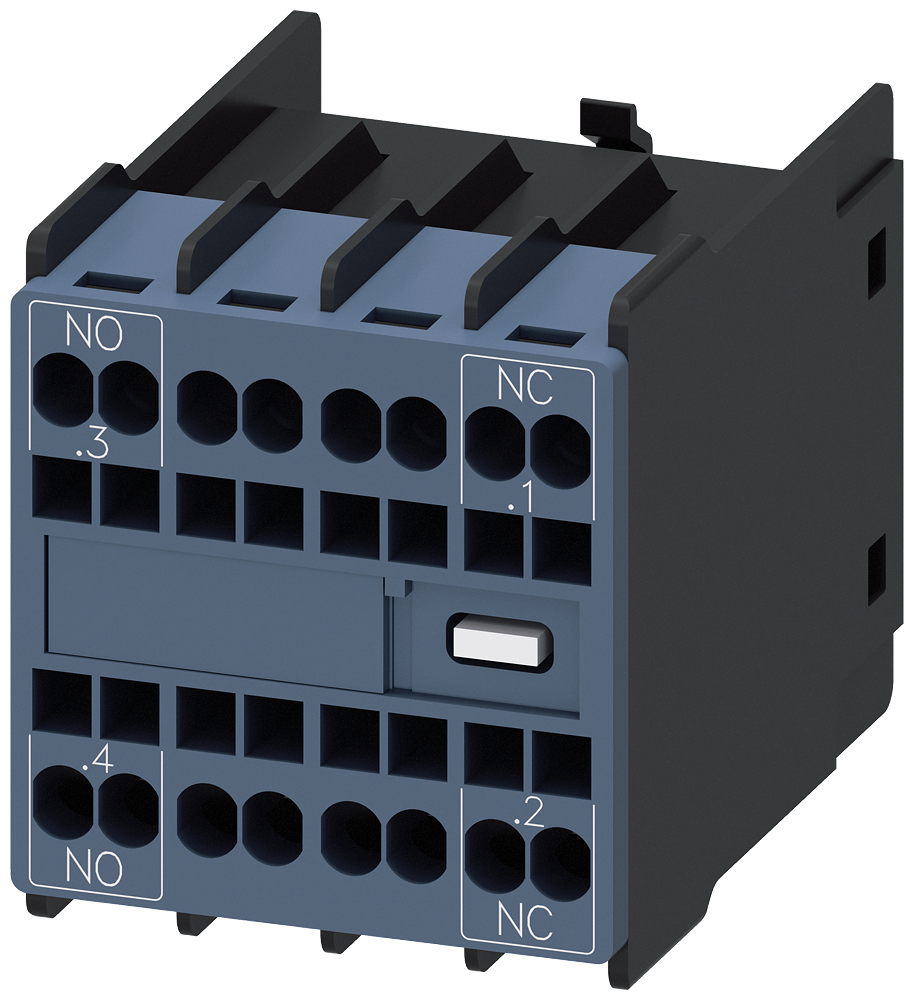 auxiliary switch, on the front, 2 NO + 2 NC, 53/54, 61/62, 71/72, 83/84, current path: 1 NO, 1 NC, 1 NC, 1 NO, spring-loaded terminal, for contactors 3RT2 and contactor relays 3RH2 auxiliary switch SIRIUS 3RH29 for the expansion of auxiliary contacts in the control circuit.The front-mounted 3RH29 auxiliary switches can be installed on 3RT2 contactors and 3RH2 contactor relays without the need for tools, regardless of size.The 3RH19/3RH29 auxiliary switches are available as versions for front or lateral mounting, with up to four instantaneous contacts or up to two leading NO and NC contacts. The auxiliary switches can be designed as positively driven contacts in 3RH contactor relays or also as mirror contacts in the case of 3RT power contactors. All of them are available with screw terminal and spring-type terminal.Simple, efficient and always up to date - SIRIUS modular system.