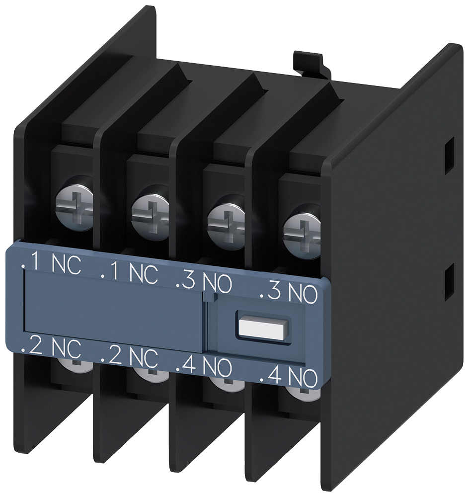 Auxiliary switch lateral, 1 NO + 1 NC Current path 1 NC, 1 NO for 3RH and 3RT screw terminal R: 21/22, 33/34 L: 41/42, 53/54 auxiliary switch SIRIUS 3RH29 for the expansion of auxiliary contacts in the control circuit.3RH29 auxiliary switches can be laterally mounted onto 3RT2 contactors without tools regardless of their size.The 3RH19/3RH29 auxiliary switches are available as versions for front or lateral mounting, with up to four instantaneous contacts or up to two leading NO and NC contacts. The auxiliary switches can be designed as positively driven contacts in 3RH contactor relays or also as mirror contacts in the case of 3RT power contactors. All of them are available with screw terminal and spring-type terminal.Simple, efficient and always up to date - SIRIUS modular system.