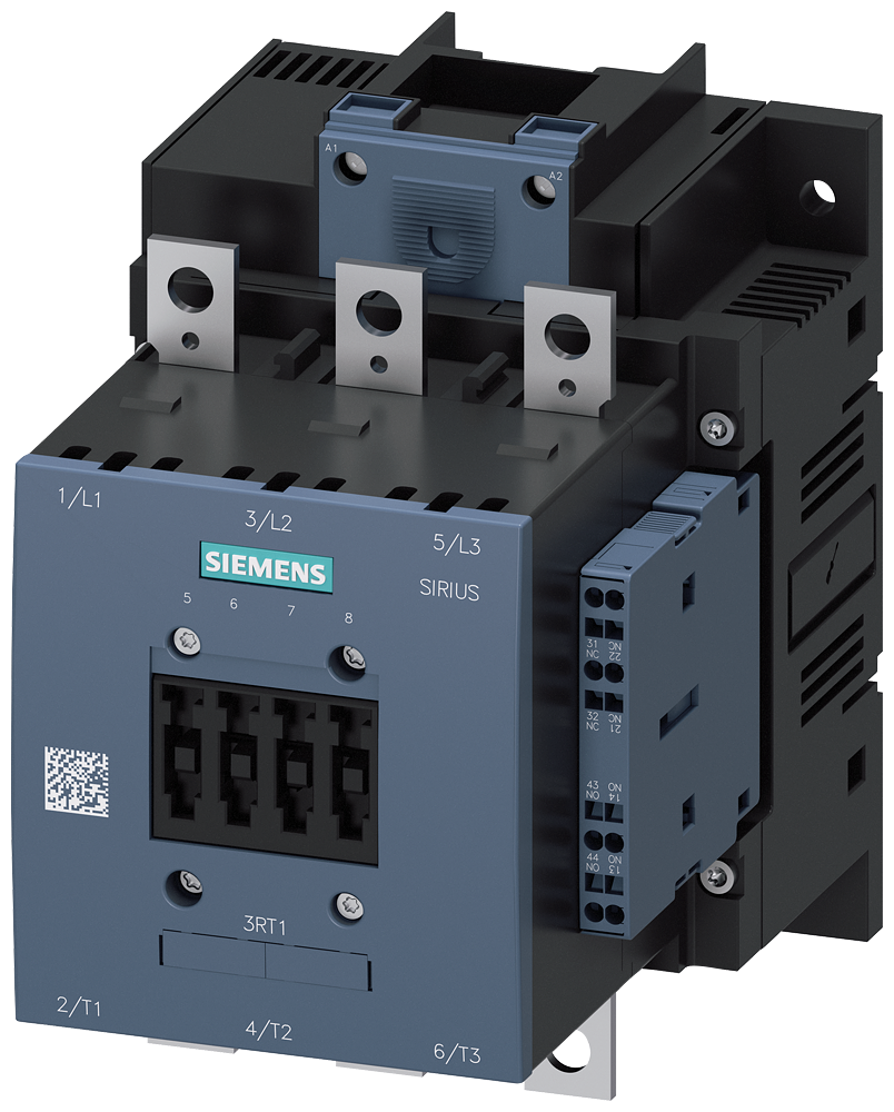 power contactor AC-1 275 A / 690 V / 40 °C 3-pole, Uc: 220-240 V AC(50-60 Hz) / DC drive: conventional auxiliary contacts 2 NO + 2 NC main circuit: busbar control and auxiliary circuit: screw terminal Contactor SIRIUS 3RT14 for switching resistive loads.The 3RT1 contactors are part of the modular SIRIUS system with its optimally coordinated products. They offer convincing performance from a compact design with high contact reliability. They can be combined with a variety of other components in the load feeder. The contactors offer the best connection to the automation level for every application (direct or via PLC input). Pre-installed auxiliary switches reduce the complexity of your design. 3RT1 contactors are climate-resistant and approved for worldwide use (e.g. IEC and UL/CSA).They are available in various sizes and in a wide performance range. They can be operated with AC or DC, and some versions have a wide voltage range and a PLC control input. The devices can be connected in the main circuit by means of rails or box terminals. For the auxiliary and control circuit they are also available with spring-type terminals for fast, maintenance-free and vibration-proof connection.A wide range of accessories is available for these contactors, such as wiring kits that considerably reduce wiring outlay, auxiliary switches or terminal covers.Simple, efficient and always up to date - SIRIUS modular system.
