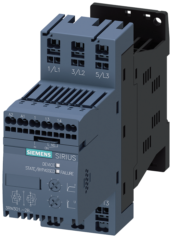 SIRIUS soft starter S0 38 A, 18.5 kW/400 V, 40 °C 200-480 V AC, 110-230 V AC/DC Screw terminals Soft starter SIRIUS 3RW30 for standard applications for the soft starting of three-phase asynchronous motors.Soft starting, reduction of current peaks, prevention of supply voltage fluctuations during startup, reduction of load on the power supply network, reduction of mechanical load in the drive, considerable saving of space and wiring compared to star-delta (wye-delta) starters and frequency converters, maintenance-free switching and extremely easy handling. The integrated bypass allows a very compactconstruction and ensures low heat dissipation in the control cabinet. Worldwide approvals (e.g. IEC and UL/CSA).The 3RW soft starters are available for supply systems up to 690 V in a wide performance range with different control supply voltages and all with both screw and spring-loaded terminals. For the 3RW30/40 there are additional versions with 24 V control supply voltage. Some of the 3RW40 up to size S3, and all 3RW44 units also offer thermistor motor protection.With the optional link module, the soft starters can be attached to the circuit breakers, even for the versions with spring-loaded terminals.Simple, efficient and always up to date - SIRIUS modular system.