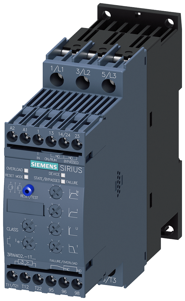 SIRIUS soft starter S0 38 A, 18.5 kW/400 V, 40 °C 200-480 V AC, 24 V AC/DC Screw terminals Soft starter SIRIUS 3RW40 for standard applications for the soft starting and ramp-down of three-phase asynchronous motors.Soft starting, reduction of current peaks, prevention of supply voltage fluctuations during startup, reduction of load on the power supply network, reduction of mechanical load in the drive, considerable saving of space and wiring compared to star-delta (wye-delta) starters and frequency converters, maintenance-free switching and extremely easy handling. The integrated bypass allows a very compact construction and ensures low heat dissipation in the control cabinet. Intelligent monitoring functions protect the soft starter against overheating and the motor against overload. In addition, you can limit the current during startup to a settable maximum value. With the integrated remote reset, you can quickly and easily clear faults from a remote location. Worldwide approvals (e.g. IEC and UL/CSA), also for applications in hazardous areas (ATEX or IEC Ex).The 3RW soft starters are available for supply systems up to 690 V in a wide performance range with different control supply voltages and all with both screw and spring-loaded terminals. For the 3RW30/40 there are additional versions with 24 V control supply voltage. Some of the 3RW40 up to size S3, and all 3RW44 units also offer thermistor motor protection.With the optional link module, the soft starters can be attached to the circuit breakers, even for the versions with spring-loaded terminals. The optional fan permits an even more compact design in the control cabinet.Simple, efficient and always up to date - SIRIUS modular system.
