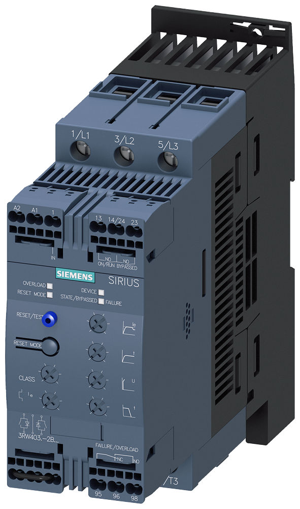 SIRIUS soft starter S3 106 A, 75 kW/500 V, 40 °C 400-600 V AC, 24 V AC/DC Screw terminals Soft starter SIRIUS 3RW40 for standard applications for the soft starting and ramp-down of three-phase asynchronous motors.Soft starting, reduction of current peaks, prevention of supply voltage fluctuations during startup, reduction of load on the power supply network, reduction of mechanical load in the drive, considerable saving of space and wiring compared to star-delta (wye-delta) starters and frequency converters, maintenance-free switching and extremely easy handling. The integrated bypass allows a very compact construction and ensures low heat dissipation in the control cabinet. Intelligent monitoring functions protect the soft starter against overheating and the motor against overload. In addition, you can limit the current during startup to a settable maximum value. With the integrated remote reset, you can quickly and easily clear faults from a remote location. Worldwide approvals (e.g. IEC and UL/CSA), also for applications in hazardous areas (ATEX or IEC Ex).The 3RW soft starters are available for supply systems up to 690 V in a wide performance range with different control supply voltages and all with both screw and spring-loaded terminals. For the 3RW30/40 there are additional versions with 24 V control supply voltage. Some of the 3RW40 up to size S3, and all 3RW44 units also offer thermistor motor protection.With the optional link module, the soft starters can be attached to the circuit breakers, even for the versions with spring-loaded terminals. The optional fan permits an even more compact design in the control cabinet.Simple, efficient and always up to date - SIRIUS modular system.