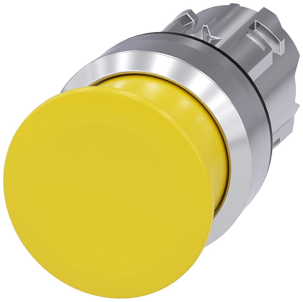 Mushroom pushbutton, 22 mm, round, metal, shiny, green, 30 mm, momentary contact type Mushroom pushbuttons SIRIUS ACT with large actuator for convenient operation using the whole hand.Under the brand name SIRIUS ACT, Siemens offers a unique portfolio of pushbuttons and signaling devices with global product approvals in three modern design lines of rugged genuine metal and high-grade plastic.An innovative snap-on concept makes the task of installing a unit so easy that it can be done with one hand and without any special tools. Groove-free holes are adequate as mounting holes since full twist prevention is already integrated.Thanks to the high degree of protection throughout, the rugged devices are suitable for use in industry and outdoors. Even cleaning with a high-pressure jet is possible. Neither dust, oils, nor caustic solutions can interfere with reliable operation.As well as standard wiring, the devices can also be connected to the controller via PROFINET, AS-Interface or IO-Link. Doing so will help you to reduce wiring time and effort, minimize error sources and have more flexibility.The graphical Online Configurator provides convenient support when selecting and ordering individual devices, enclosures and labels. Extensive documentation (e.g. manual, 3D data, terminal diagram) is available.Versions available: 30/40/60 mm mushroom diameter, several colors, illuminated/non-illuminated, latching/momentary contact operation, pull-to-unlatch/rotate-to-unlatch mechanism.Note: Single device, please order holders and modules separately.SIRIUS ACT - Performance in action for control and signalling. Simply mounted, simply strong, simply perfect.