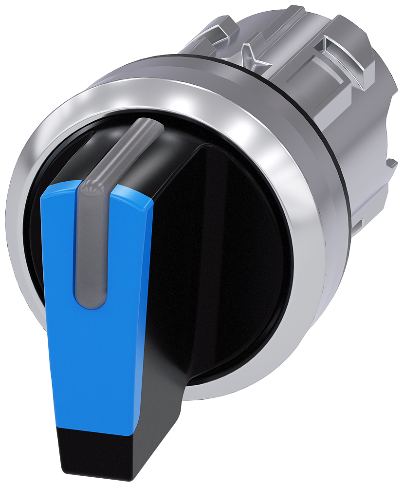 Illuminable selector switch, 22 mm, round, metal shiny, black, Selector switch long, 2 switch positions O-I, latching, actuating angle 90?, 10:30h/13:30h Selector switches SIRIUS ACT for switching and controlling electrical loads.Under the brand name SIRIUS ACT, Siemens offers a unique portfolio of pushbuttons and signaling devices with global product approvals in three modern design lines of rugged genuine metal and high-grade plastic.An innovative snap-on concept makes the task of installing a unit so easy that it can be done with one hand and without any special tools. Groove-free holes are adequate as mounting holes since full twist prevention is already integrated.Thanks to the high degree of protection throughout, the rugged devices are suitable for use in industry and outdoors. Even cleaning with a high-pressure jet is possible. Neither dust, oils, nor caustic solutions can interfere with reliable operation.As well as standard wiring, the devices can also be connected to the controller via PROFINET, AS-Interface or IO-Link. Doing so will help you to reduce wiring time and effort, minimize error sources and have more flexibility.The graphical Online Configurator provides convenient support when selecting and ordering individual devices, enclosures and labels. Extensive documentation (e.g. manual, 3D data, terminal diagram) is available.Versions available: Several colors, 2-4 switching positions, short/long selector or rotary knob, illuminated/non-illuminated (lighting can also be retrofitted), latching/momentary contact operation.Note: Single device, please order holders and modules separately.SIRIUS ACT - Performance in action for controland signalling. Simply mounted, simply strong, simply perfect.