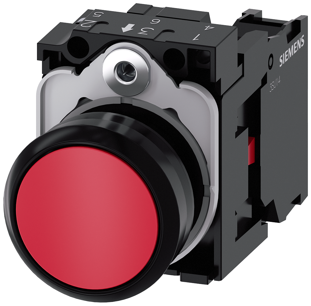 Pushbutton, 22 mm, round, plastic, red, pushbutton, flat, momentary contact type, with holder 1 NO+1 NC, screw terminal, Pushbuttons SIRIUS ACT for switching and controlling electrical loads.Under the brand name SIRIUS ACT, Siemens offers a unique portfolio of pushbuttons and signaling devices with global product approvals in three modern design lines of rugged genuine metal and high-grade plastic.An innovative snap-on concept makes the task of installing a unit so easy that it can be done with one hand and without any special tools. Groove-free holes are adequate as mounting holes since full twist prevention is already integrated.Thanks to the high degree of protection throughout, the rugged devices are suitable for use in industry and outdoors. Even cleaning with a high-pressure jet is possible. Neither dust, oils, nor caustic solutions can interfere with reliable operation.As well as standard wiring, the devices can also be connected to the controller via PROFINET, AS-Interface or IO-Link. Doing so will help you to reduce wiring time and effort, minimize error sources and have more flexibility.The graphical OnlineConfigurator provides convenient support when selecting and ordering individual devices, enclosures and labels. Extensive documentation (e.g. manual, 3D data, terminal diagram) is available.Versions available: Several colors, illuminated/non-illuminated, with/without inscription, latching/momentary contact operation, various button and front ring heights.Note: Complete unit, delivery includes holders and modules.SIRIUS ACT - Performance in action for control and signalling. Simply mounted, simply strong, simply perfect.