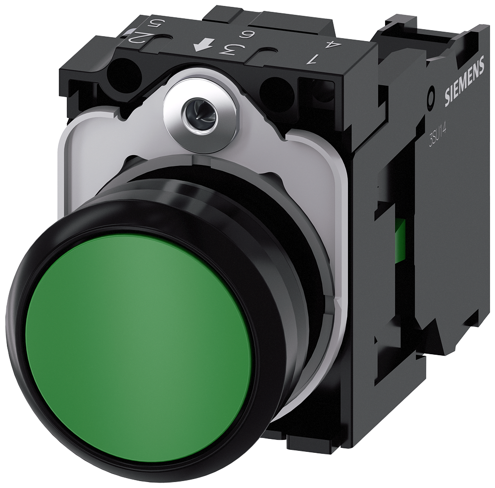 Pushbutton, 22 mm, round, plastic, green, pushbutton, flat, momentary contact type, with holder 1 NO+1 NC, screw terminal, Pushbuttons SIRIUS ACT for switching and controlling electrical loads.Under the brand name SIRIUS ACT, Siemens offers a unique portfolio of pushbuttons and signaling devices with global product approvals in three modern design lines of rugged genuine metal and high-grade plastic.An innovative snap-on concept makes the task of installing a unit so easy that it can be done with one hand and without any special tools. Groove-free holes are adequate as mounting holes since full twist prevention is already integrated.Thanks to the high degree of protection throughout, the rugged devices are suitable for use in industry and outdoors. Even cleaning with a high-pressure jet is possible. Neither dust, oils, nor caustic solutions can interfere with reliable operation.As well as standard wiring, the devices can also be connected to the controller via PROFINET, AS-Interface or IO-Link. Doing so will help you to reduce wiring time and effort, minimize error sources and have more flexibility.The graphical OnlineConfigurator provides convenient support when selecting and ordering individual devices, enclosures and labels. Extensive documentation (e.g. manual, 3D data, terminal diagram) is available.Versions available: Several colors, illuminated/non-illuminated, with/without inscription, latching/momentary contact operation, various button and front ring heights.Note: Complete unit, delivery includes holders and modules.SIRIUS ACT - Performance in action for control and signalling. Simply mounted, simply strong, simply perfect.