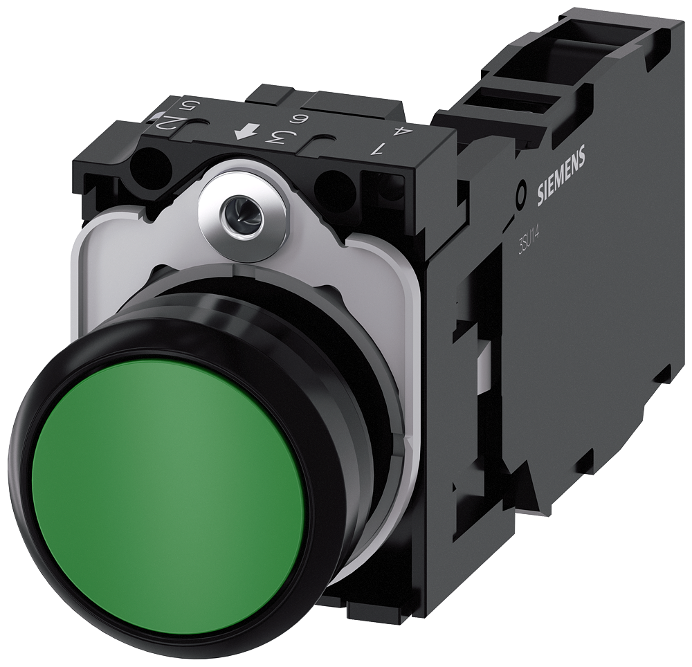 Pushbutton, 22 mm, round, plastic, white, pushbutton, flat, momentary contact type, with holder 1 NO, screw terminal Pushbuttons SIRIUS ACT for switching and controlling electrical loads.Under the brand name SIRIUS ACT, Siemens offers a unique portfolio of pushbuttons and signaling devices with global product approvals in three modern design lines of rugged genuine metal and high-grade plastic.An innovative snap-on concept makes the task of installing a unit so easy that it can be done with one hand and without any special tools. Groove-free holes are adequate as mounting holes since full twist prevention is already integrated.Thanks to the high degree of protection throughout, the rugged devices are suitable for use in industry and outdoors. Even cleaning with a high-pressure jet is possible. Neither dust, oils, nor caustic solutions can interfere with reliable operation.As well as standard wiring, the devices can also be connected to the controller via PROFINET, AS-Interface or IO-Link. Doing so will help you to reduce wiring time and effort, minimize error sources and have more flexibility.The graphical OnlineConfigurator provides convenient support when selecting and ordering individual devices, enclosures and labels. Extensive documentation (e.g. manual, 3D data, terminal diagram) is available.Versions available: Several colors, illuminated/non-illuminated, with/without inscription, latching/momentary contact operation, various button and front ring heights.Note: Complete unit, delivery includes holders and modules.SIRIUS ACT - Performance in action for control and signalling. Simply mounted, simply strong, simply perfect.