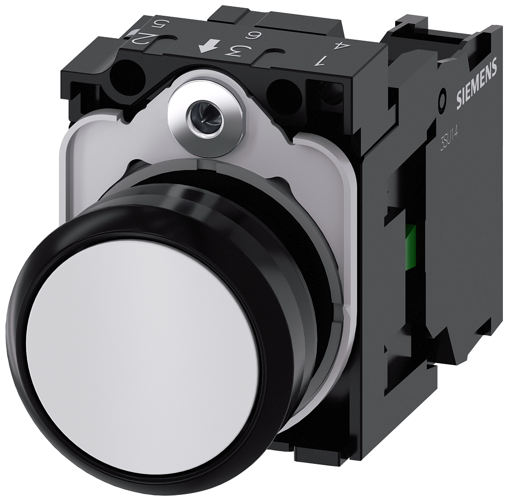 Illuminated pushbutton, 22 mm, round, plastic, red, pushbutton, flat, momentary contact type, with holder, 1 NO, LED module with integrated LED 24 V AC/DC, screw terminal Illuminated pushbuttons SIRIUS ACT for switching and controlling electrical loads.Under the brand name SIRIUS ACT, Siemens offers a unique portfolio of pushbuttons and signaling devices with global product approvals in three modern design lines of rugged genuine metal and high-grade plastic.An innovative snap-on concept makes the task of installing a unit so easy that it can be done with one hand and without any special tools. Groove-free holes are adequate as mounting holes since full twist preventionis already integrated.Thanks to the high degree of protection throughout, the rugged devices are suitable for use in industry and outdoors. Even cleaning with a high-pressure jet is possible. Neither dust, oils, nor caustic solutions can interfere with reliable operation.As well as standard wiring, the devices can also be connected to the controller via PROFINET, AS-Interface or IO-Link. Doing so will help you to reduce wiring time and effort, minimize error sources and have more flexibility.The graphical Online Configurator provides convenient support when selecting and ordering individual devices, enclosures and labels. Extensive documentation (e.g. manual, 3D data, terminal diagram) is available.Versions available: Several colors, illuminated/non-illuminated, with/without inscription, latching/momentary contact operation, various button and front ring heights.Note: Complete unit, delivery includes holders and modules.SIRIUS ACT - Performance in action for control and signalling. Simply mounted, simply strong, simply perfect.