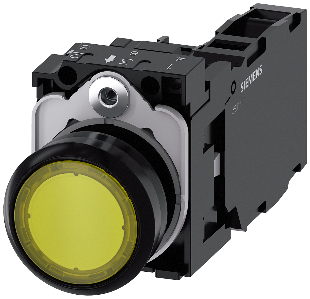 Illuminated pushbutton, 22 mm, round, plastic, green, pushbutton, flat, momentary contact type, with holder, 1 NO, LED module with integrated LED 24 V AC/DC, screw terminal Illuminated pushbuttons SIRIUS ACT for switching and controlling electrical loads.Under the brand name SIRIUS ACT, Siemens offers a unique portfolio of pushbuttons and signaling devices with global product approvals in three modern design lines of rugged genuine metal and high-grade plastic.An innovative snap-on concept makes the task of installing a unit so easy that it can be done with one hand and without any special tools. Groove-free holes are adequate as mounting holes since full twist preventionis already integrated.Thanks to the high degree of protection throughout, the rugged devices are suitable for use in industry and outdoors. Even cleaning with a high-pressure jet is possible. Neither dust, oils, nor caustic solutions can interfere with reliable operation.As well as standard wiring, the devices can also be connected to the controller via PROFINET, AS-Interface or IO-Link. Doing so will help you to reduce wiring time and effort, minimize error sources and have more flexibility.The graphical Online Configurator provides convenient support when selecting and ordering individual devices, enclosures and labels. Extensive documentation (e.g. manual, 3D data, terminal diagram) is available.Versions available: Several colors, illuminated/non-illuminated, with/without inscription, latching/momentary contact operation, various button and front ring heights.Note: Complete unit, delivery includes holders and modules.SIRIUS ACT - Performance in action for control and signalling. Simply mounted, simply strong, simply perfect.