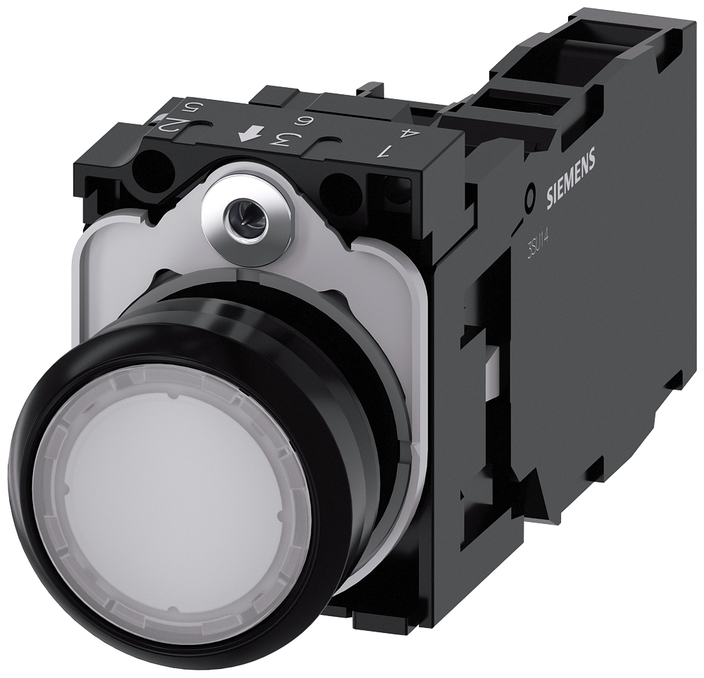 Illuminated pushbutton, 22 mm, round, plastic, clear, pushbutton, flat, momentary contact type, with holder, 1 NO+1 NC, LED module with integrated LED 24 V AC/DC, screw terminal Illuminated pushbuttons SIRIUS ACT for switching and controlling electrical loads.Under the brand name SIRIUS ACT, Siemens offers a unique portfolio of pushbuttons and signaling devices with global product approvals in three modern design lines of rugged genuine metal and high-grade plastic.An innovative snap-on concept makes the task of installing a unit so easy that it can be done with one hand and without any special tools. Groove-free holes are adequate as mounting holes since full twist preventionis already integrated.Thanks to the high degree of protection throughout, the rugged devices are suitable for use in industry and outdoors. Even cleaning with a high-pressure jet is possible. Neither dust, oils, nor caustic solutions can interfere with reliable operation.As well as standard wiring, the devices can also be connected to the controller via PROFINET, AS-Interface or IO-Link. Doing so will help you to reduce wiring time and effort, minimize error sources and have more flexibility.The graphical Online Configurator provides convenient support when selecting and ordering individual devices, enclosures and labels. Extensive documentation (e.g. manual, 3D data, terminal diagram) is available.Versions available: Several colors, illuminated/non-illuminated, with/without inscription, latching/momentary contact operation, various button and front ring heights.Note: Complete unit, delivery includes holders and modules.SIRIUS ACT - Performance in action for control and signalling. Simply mounted, simply strong, simply perfect.