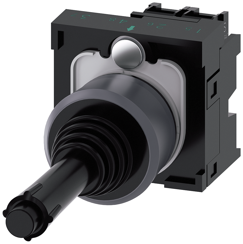 Coordinate switch, 22 mm, round, plastic, black, 2 switch positions, horizontal latching, with mechanical interlocking, in O position, with holder, 1 NO, 1 NO, screw terminal, Coordinate switches SIRIUS ACT for simple navigation tasks.Under the brand name SIRIUS ACT, Siemens offers a unique portfolio of pushbuttons and signaling devices with global product approvals in three modern design lines of rugged genuine metal and high-grade plastic.An innovative snap-on concept makes the task of installing a unit so easy that it can be done with one hand and without any special tools. Groove-free holes are adequate as mounting holes since full twist prevention is already integrated.Thanks to the high degree of protection throughout, the rugged devices are suitable for use in industry and outdoors. Even cleaning with a high-pressure jet is possible. Neither dust, oils, nor caustic solutions can interfere with reliable operation.As well as standard wiring, the devices can also be connected to the controller via PROFINET, AS-Interface or IO-Link. Doing so will help you to reduce wiring time and effort, minimize error sources and have more flexibility.The graphical Online Configurator provides convenient support when selecting and ordering individual devices, enclosures and labels. Extensive documentation (e.g. manual, 3D data, terminal diagram) is available.Versions available: 2/4 switching positions, latching/momentary-contact operation.Note: Complete unit, delivery includes holders and modules.SIRIUS ACT - Performance in action for control and signalling. Simply mounted, simply strong, simply perfect.