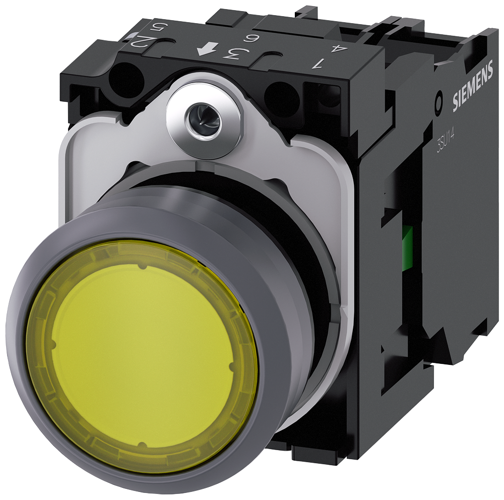 Illuminated pushbutton, 22 mm, round, plastic with metal front ring, green, pushbutton, flat, momentary contact type, with holder, 1 NO, LED module with integrated LED 24 V AC/DC, screw terminal Illuminated pushbuttons SIRIUS ACT for switching and controlling electrical loads.Under the brand name SIRIUS ACT, Siemens offers a unique portfolio of pushbuttons and signaling devices with global product approvals in three modern design lines of rugged genuine metal and high-grade plastic.An innovative snap-on concept makes the task of installing a unit so easy that it can be done with one hand and without any special tools. Groove-free holes are adequate as mounting holes since full twist preventionis already integrated.Thanks to the high degree of protection throughout, the rugged devices are suitable for use in industry and outdoors. Even cleaning with a high-pressure jet is possible. Neither dust, oils, nor caustic solutions can interfere with reliable operation.As well as standard wiring, the devices can also be connected to the controller via PROFINET, AS-Interface or IO-Link. Doing so will help you to reduce wiring time and effort, minimize error sources and have more flexibility.The graphical Online Configurator provides convenient support when selecting and ordering individual devices, enclosures and labels. Extensive documentation (e.g. manual, 3D data, terminal diagram) is available.Versions available: Several colors, illuminated/non-illuminated, with/without inscription, latching/momentary contact operation, various button and front ring heights.Note: Complete unit, delivery includes holders and modules.SIRIUS ACT - Performance in action for control and signalling. Simply mounted, simply strong, simply perfect.