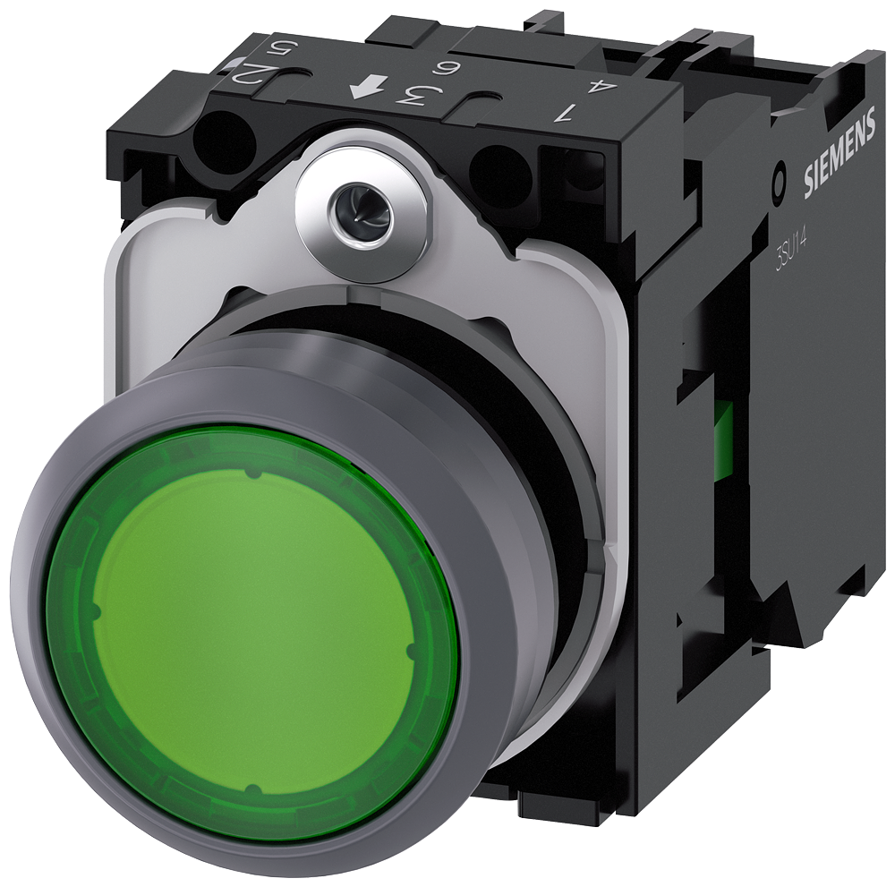 Illuminated pushbutton, 22 mm, round, plastic with metal front ring, blue, pushbutton, flat, momentary contact type, with holder, 1 NO+1 NC, LED module with integrated LED 24 V AC/DC, screw terminal Illuminated pushbuttons SIRIUS ACT for switching and controlling electrical loads.Under the brand name SIRIUS ACT, Siemens offers a unique portfolio of pushbuttons and signaling devices with global product approvals in three modern design lines of rugged genuine metal and high-grade plastic.An innovative snap-on concept makes the task of installing a unit so easy that it can be done with one hand and without any special tools. Groove-free holes are adequate as mounting holes since full twist preventionis already integrated.Thanks to the high degree of protection throughout, the rugged devices are suitable for use in industry and outdoors. Even cleaning with a high-pressure jet is possible. Neither dust, oils, nor caustic solutions can interfere with reliable operation.As well as standard wiring, the devices can also be connected to the controller via PROFINET, AS-Interface or IO-Link. Doing so will help you to reduce wiring time and effort, minimize error sources and have more flexibility.The graphical Online Configurator provides convenient support when selecting and ordering individual devices, enclosures and labels. Extensive documentation (e.g. manual, 3D data, terminal diagram) is available.Versions available: Several colors, illuminated/non-illuminated, with/without inscription, latching/momentary contact operation, various button and front ring heights.Note: Complete unit, delivery includes holders and modules.SIRIUS ACT - Performance in action for control and signalling. Simply mounted, simply strong, simply perfect.