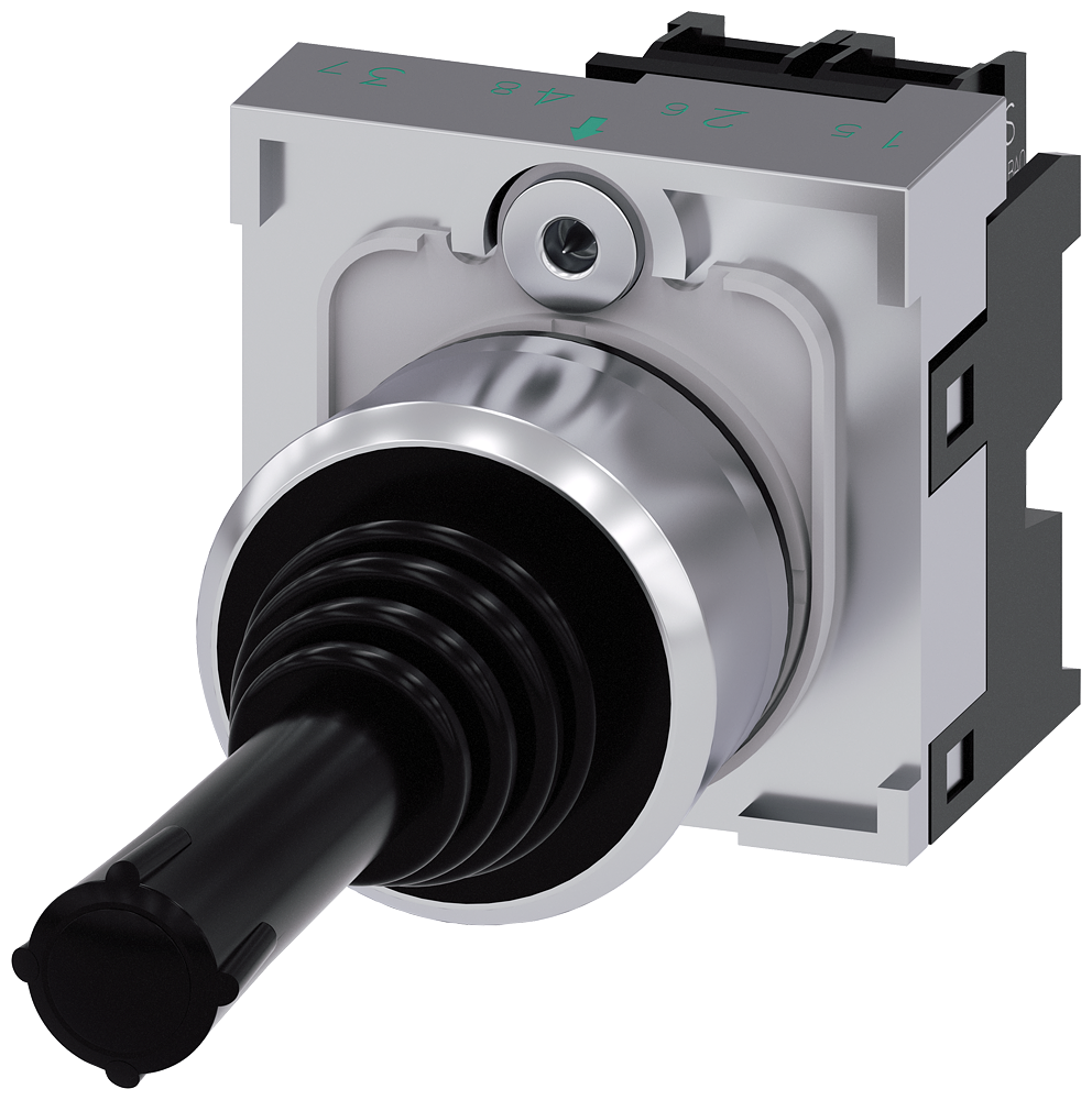Coordinate switch, 22 mm, round, metal shiny, black, 2 switch positions, vertical momentary contact type, with mechanical interlocking, in O position, with holder, 1 NO, 1 NO, screw terminal, Coordinate switches SIRIUS ACT for simple navigation tasks.Under the brand name SIRIUS ACT, Siemens offers a unique portfolio of pushbuttons and signaling devices with global product approvals in three modern design lines of rugged genuine metal and high-grade plastic.An innovative snap-on concept makes the task of installing a unit so easy that it can be done with one hand and without any special tools. Groove-free holes are adequate as mounting holes since full twist prevention is already integrated.Thanks to the high degree of protection throughout, the rugged devices are suitable for use in industry and outdoors. Even cleaning with a high-pressure jet is possible. Neither dust, oils, nor caustic solutions can interfere with reliable operation.As well as standard wiring, the devices can also be connected to the controller via PROFINET, AS-Interface or IO-Link. Doing so will help you to reduce wiring time and effort, minimize error sources and have more flexibility.The graphical Online Configurator provides convenient support when selecting and ordering individual devices, enclosures and labels. Extensive documentation (e.g. manual, 3D data, terminal diagram) is available.Versions available: 2/4 switching positions, latching/momentary-contact operation.Note: Complete unit, delivery includes holders and modules.SIRIUS ACT - Performance in action for control and signalling. Simply mounted, simply strong, simply perfect.