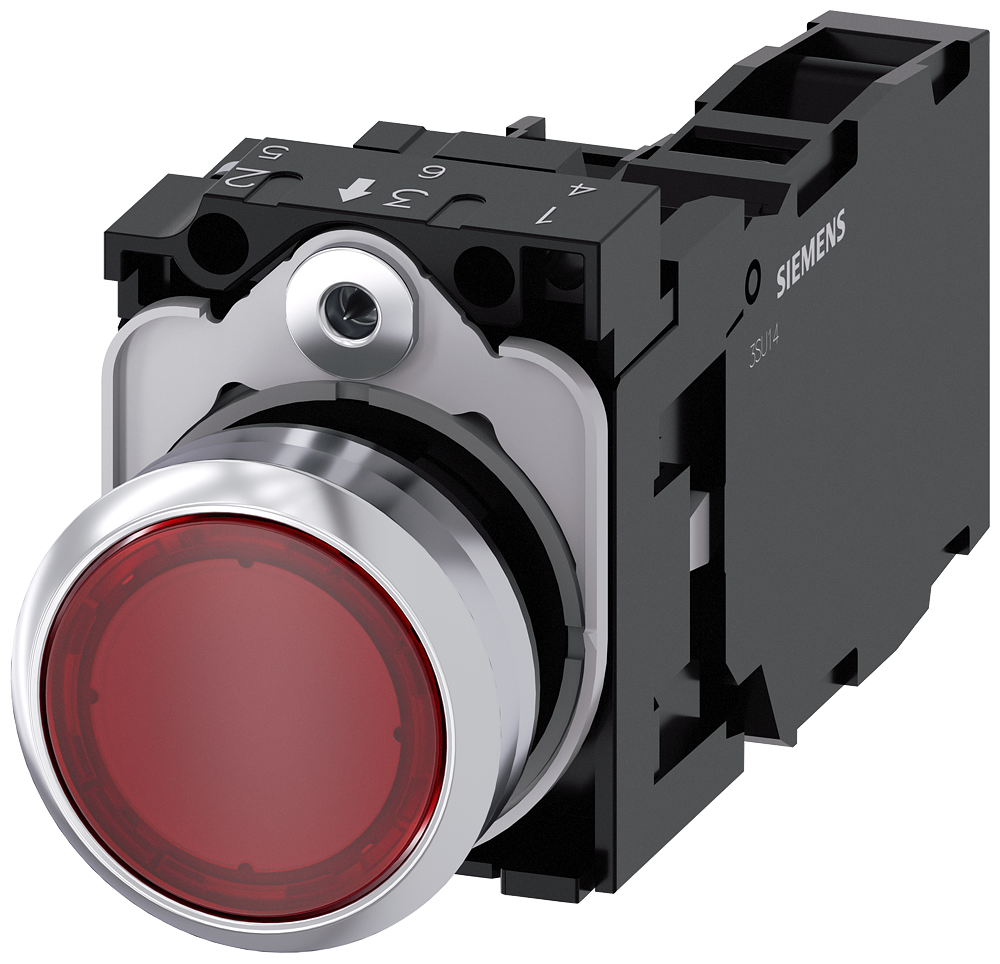 Illuminated pushbutton, 22 mm, round, metal, shiny, yellow, pushbutton, flat, momentary contact type, with holder, 1 NO, LED module with integrated LED 110 V AC, screw terminal Illuminated pushbuttons SIRIUS ACT for switching and controlling electrical loads.Under the brand name SIRIUS ACT, Siemens offers a unique portfolio of pushbuttons and signaling devices with global product approvals in three modern design lines of rugged genuine metal and high-grade plastic.An innovative snap-on concept makes the task of installing a unit so easy that it can be done with one hand and without any special tools. Groove-free holes are adequate as mounting holes since full twist preventionis already integrated.Thanks to the high degree of protection throughout, the rugged devices are suitable for use in industry and outdoors. Even cleaning with a high-pressure jet is possible. Neither dust, oils, nor caustic solutions can interfere with reliable operation.As well as standard wiring, the devices can also be connected to the controller via PROFINET, AS-Interface or IO-Link. Doing so will help you to reduce wiring time and effort, minimize error sources and have more flexibility.The graphical Online Configurator provides convenient support when selecting and ordering individual devices, enclosures and labels. Extensive documentation (e.g. manual, 3D data, terminal diagram) is available.Versions available: Several colors, illuminated/non-illuminated, with/without inscription, latching/momentary contact operation, various button and front ring heights.Note: Complete unit, delivery includes holders and modules.SIRIUS ACT - Performance in action for control and signalling. Simply mounted, simply strong, simply perfect.