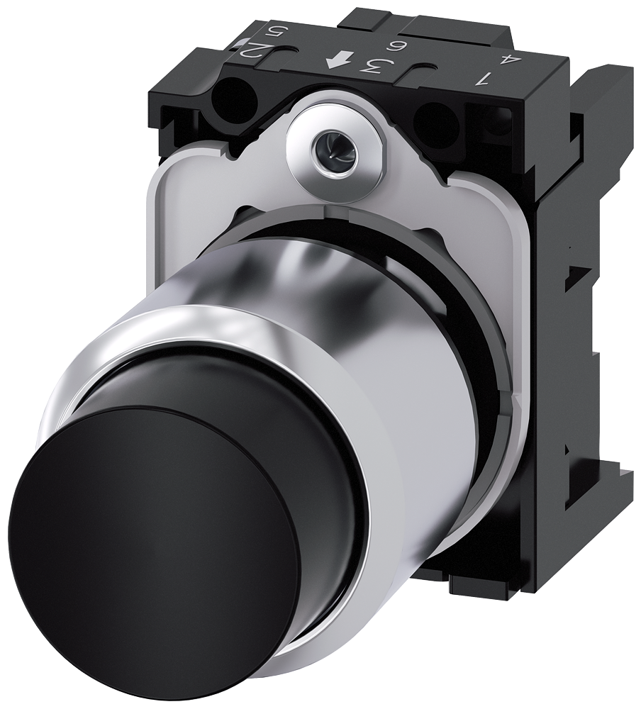 Pushbutton, 22 mm, round, metal, shiny, red, pushbutton, flat momentary contact type Pushbuttons SIRIUS ACT for switching and controlling electrical loads.Under the brand name SIRIUS ACT, Siemens offers a unique portfolio of pushbuttons and signaling devices with global product approvals in three modern design lines of rugged genuine metal and high-grade plastic.An innovative snap-on concept makes the task of installing a unit so easy that it can be done with one hand and without any special tools. Groove-free holes are adequate as mounting holes since full twist prevention is already integrated.Thanks to the high degree of protection throughout, the rugged devices are suitable for use in industry and outdoors. Even cleaning with a high-pressure jet is possible. Neither dust, oils, nor caustic solutions can interfere with reliable operation.As well as standard wiring, the devices can also be connected to the controller via PROFINET, AS-Interface or IO-Link. Doing so will help you to reduce wiring time and effort, minimize error sources and have more flexibility.The graphical OnlineConfigurator provides convenient support when selecting and ordering individual devices, enclosures and labels. Extensive documentation (e.g. manual, 3D data, terminal diagram) is available.Versions available: Several colors, illuminated/non-illuminated, with/without inscription, latching/momentary contact operation, various button and front ring heights.Note: Single device, please order holders and modules separately.SIRIUS ACT - Performance in action for control and signalling. Simply mounted, simply strong, simply perfect.