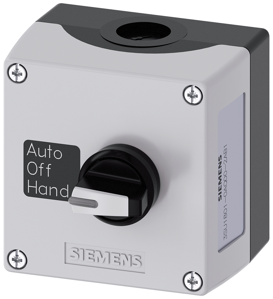 Enclosure for command devices, 22 mm, round, enclosure material plastic, enclosure top part gray, 1 control point, A = selector switch, black, metal 2 switch positions, momentary contact, 1 NO, spring-type terminal, floor mounting, support terminal, without label, 1xM20 each on top and bottom Enclosures SIRIUS ACT for mounting the 22.5?mm pushbuttons and indicator lights for separately allocated control units and cabinets.Under the brand name SIRIUS ACT, Siemens offers a unique portfolio of pushbuttons and signaling devices with global product approvals in three modern design lines of rugged genuine metal and high-grade plastic.An innovative snap-on concept makes the task of installing a unit so easy that it can be done with one hand and without any special tools. Groove-free holes are adequate as mounting holes since full twist prevention is already integrated.Thanks to the high degree of protection throughout, the rugged devices are suitable for use in industry and outdoors. Even cleaning with a high-pressure jet is possible. Neither dust, oils, nor caustic solutions can interfere with reliable operation.As well as standard wiring, the devices can also be connected to the controller via PROFINET, AS-Interface or IO-Link. Doing so will help you to reduce wiring time and effort, minimize error sources and have more flexibility.The graphical Online Configurator provides convenient support when selecting and ordering individual devices, enclosures and labels. Extensive documentation (e.g. manual, 3D data, terminal diagram) is available.Versions available: Yellow/gray, plastic/metal, 1-6 command points, empty enclosure/pre-equipped, optionally with AS-Interface connection.SIRIUS ACT - Performance in action for control and signalling. Simply mounted, simply strong, simply perfect.