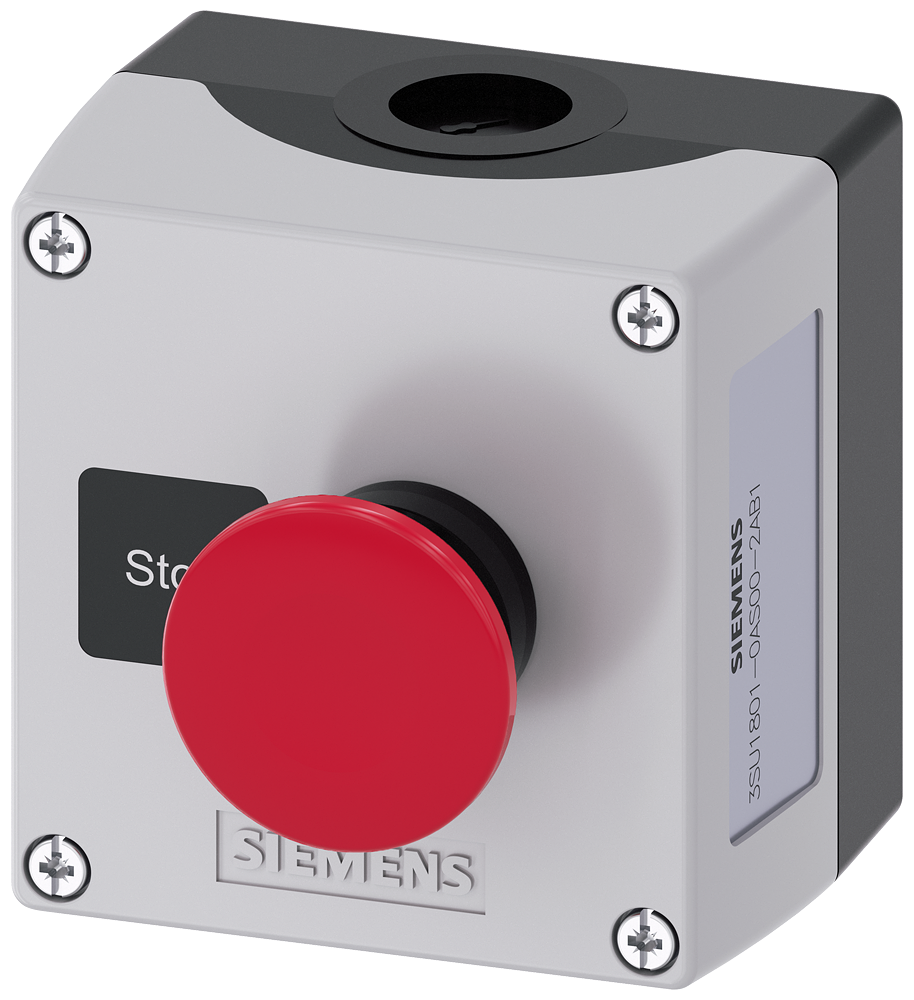 Enclosure for command devices, 22 mm, round, Enclosure material plastic, Enclosure top part yellow, 1 control point plastic, Control point in center, A=EMERGENCY STOP mushroom pushbutton red, 40 mm, rotate-to-unlatch, 1 NC, screw terminal, floor mounting, 1xM20 each on top and bottom Enclosures SIRIUS ACT for mounting the 22.5?mm pushbuttons and indicator lights for separately allocated control units and cabinets.Under the brand name SIRIUS ACT, Siemens offers a unique portfolio of pushbuttons and signaling devices with global product approvals in three modern design lines of rugged genuine metal and high-grade plastic.An innovative snap-on concept makes the task of installing a unit so easy that it can be done with one hand and without any special tools. Groove-free holes are adequate as mounting holes since full twist prevention is already integrated.Thanks to the high degree of protection throughout, the rugged devices are suitable for use in industry and outdoors. Even cleaning with a high-pressure jet is possible. Neither dust, oils, nor caustic solutions can interfere with reliable operation.As well as standard wiring, the devices can also be connected to the controller via PROFINET, AS-Interface or IO-Link. Doing so will help you to reduce wiring time and effort, minimize error sources and have more flexibility.The graphical Online Configurator provides convenient support when selecting and ordering individual devices, enclosures and labels. Extensive documentation (e.g. manual, 3D data, terminal diagram) is available.Versions available: Yellow/gray, plastic/metal, 1-6 command points, empty enclosure/pre-equipped, optionally with AS-Interface connection.SIRIUS ACT - Performance in action for control and signalling. Simply mounted, simply strong, simply perfect.