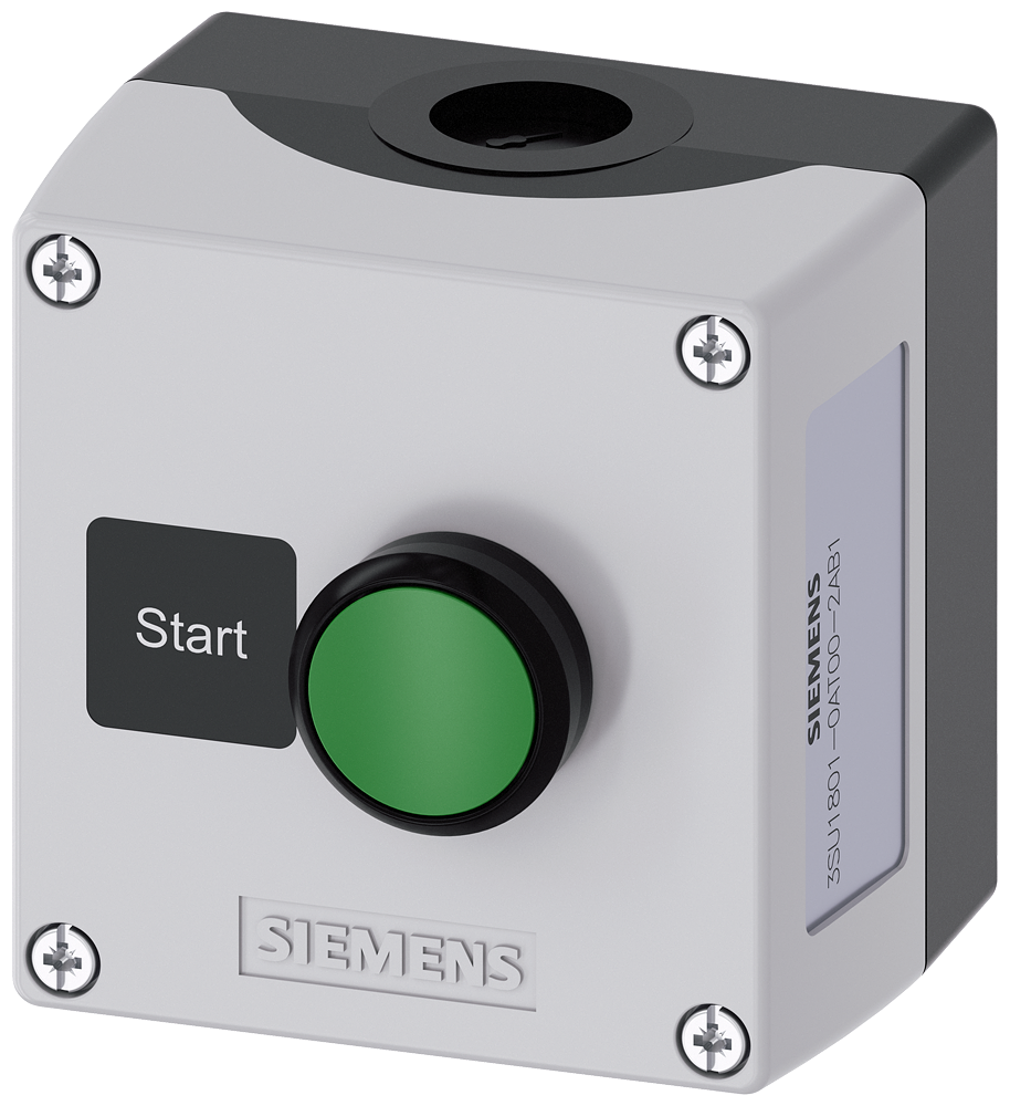 enclosure for command devices, 22 mm, round, enclosure material plastic, enclosure top part yellow, 1 control point plastic, control point in center, A=EMERGENCY STOP mushroom pushbutton red, illuminable, 40 mm, rotate-to-unlatch, 1 NC, screw terminal, 1 LED 6-24 V, AC/DC, red, screw terminal, floor mounting, EMERGENCY STOP label, 75 mm, with inscription: NOTRUF, EMERGENCY CALL, 1xM20 each on top and bottom Enclosures SIRIUS ACT for mounting the 22.5?mm pushbuttons and indicator lights for separately allocated control units and cabinets.Under the brand name SIRIUS ACT, Siemens offers a unique portfolio of pushbuttons and signaling devices with global product approvals in three modern design lines of rugged genuine metal and high-grade plastic.An innovative snap-on concept makes the task of installing a unit so easy that it can be done with one hand and without any special tools. Groove-free holes are adequate as mounting holes since full twist prevention is already integrated.Thanks to the high degree of protection throughout, the rugged devices are suitable for use in industry and outdoors. Even cleaning with a high-pressure jet is possible. Neither dust, oils, nor caustic solutions can interfere with reliable operation.As well as standard wiring, the devices can also be connected to the controller via PROFINET, AS-Interface or IO-Link. Doing so will help you to reduce wiring time and effort, minimize error sources and have more flexibility.The graphical Online Configurator provides convenient support when selecting and ordering individual devices, enclosures and labels. Extensive documentation (e.g. manual, 3D data, terminal diagram) is available.Versions available: Yellow/gray, plastic/metal, 1-6 command points, empty enclosure/pre-equipped, optionally with AS-Interface connection.SIRIUS ACT - Performance in action for control and signalling. Simply mounted, simply strong, simply perfect.
