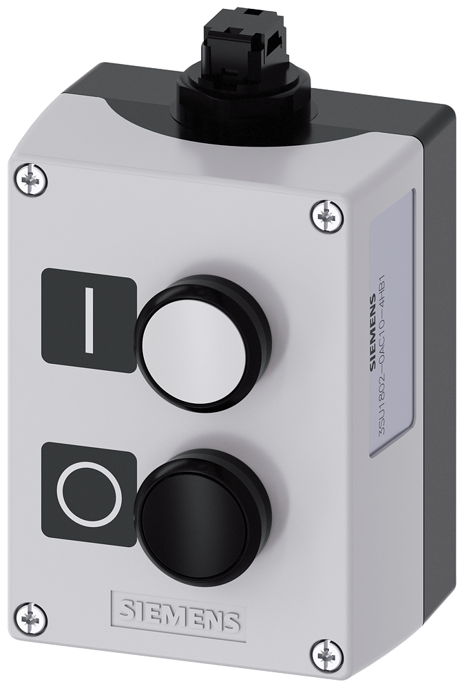 enclosure for command devices, 22 mm, round, enclosure material plastic, enclosure top part gray, 2 control points plastic, B=Pushbutton green, label: Up, 1 NO, screw terminal, A=Pushbutton black, label: Down, 1 NO, screw terminal, floor mounting, 1xM20 each on top and bottom, Labels glued in Enclosures SIRIUS ACT for mounting the 22.5?mm pushbuttons and indicator lights for separately allocated control units and cabinets.Under the brand name SIRIUS ACT, Siemens offers a unique portfolio of pushbuttons and signaling devices with global product approvals in three modern design lines of rugged genuine metal and high-grade plastic.An innovative snap-on concept makes the task of installing a unit so easy that it can be done with one hand and without any special tools. Groove-free holes are adequate as mounting holes since full twist prevention is already integrated.Thanks to the high degree of protection throughout, the rugged devices are suitable for use in industry and outdoors. Even cleaning with a high-pressure jet is possible. Neither dust, oils, nor caustic solutions can interfere with reliable operation.As well as standard wiring, the devices can also be connected to the controller via PROFINET, AS-Interface or IO-Link. Doing so will help you to reduce wiring time and effort, minimize error sources and have more flexibility.The graphical Online Configurator provides convenient support when selecting and ordering individual devices, enclosures and labels. Extensive documentation (e.g. manual, 3D data, terminal diagram) is available.Versions available: Yellow/gray, plastic/metal, 1-6 command points, empty enclosure/pre-equipped, optionally with AS-Interface connection.SIRIUS ACT - Performance in action for control and signalling. Simply mounted, simply strong, simply perfect.